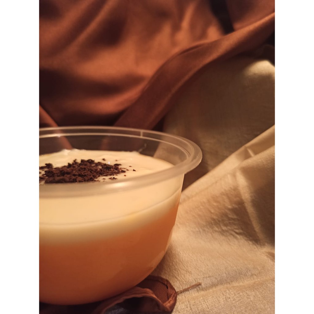 Pudding Mangga lembut yang dilengkapi dengan fla susu gurih dan taburan coklat di atasnya.