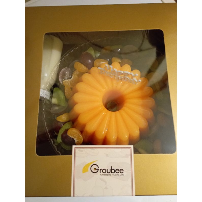 Pudding rasa Mangga dengan irisan buah²an di sekitarnya (Kiwi, Anggur, Jeruk, Strawberry/Kelengkeng) ditambah dengan Saus Vla..