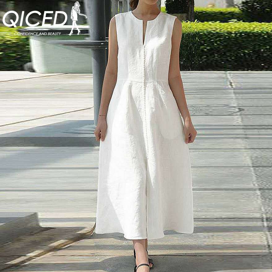 QICED Платье без рукавов с V-образным вырезом и поясом из хлопка и льна под разворотом