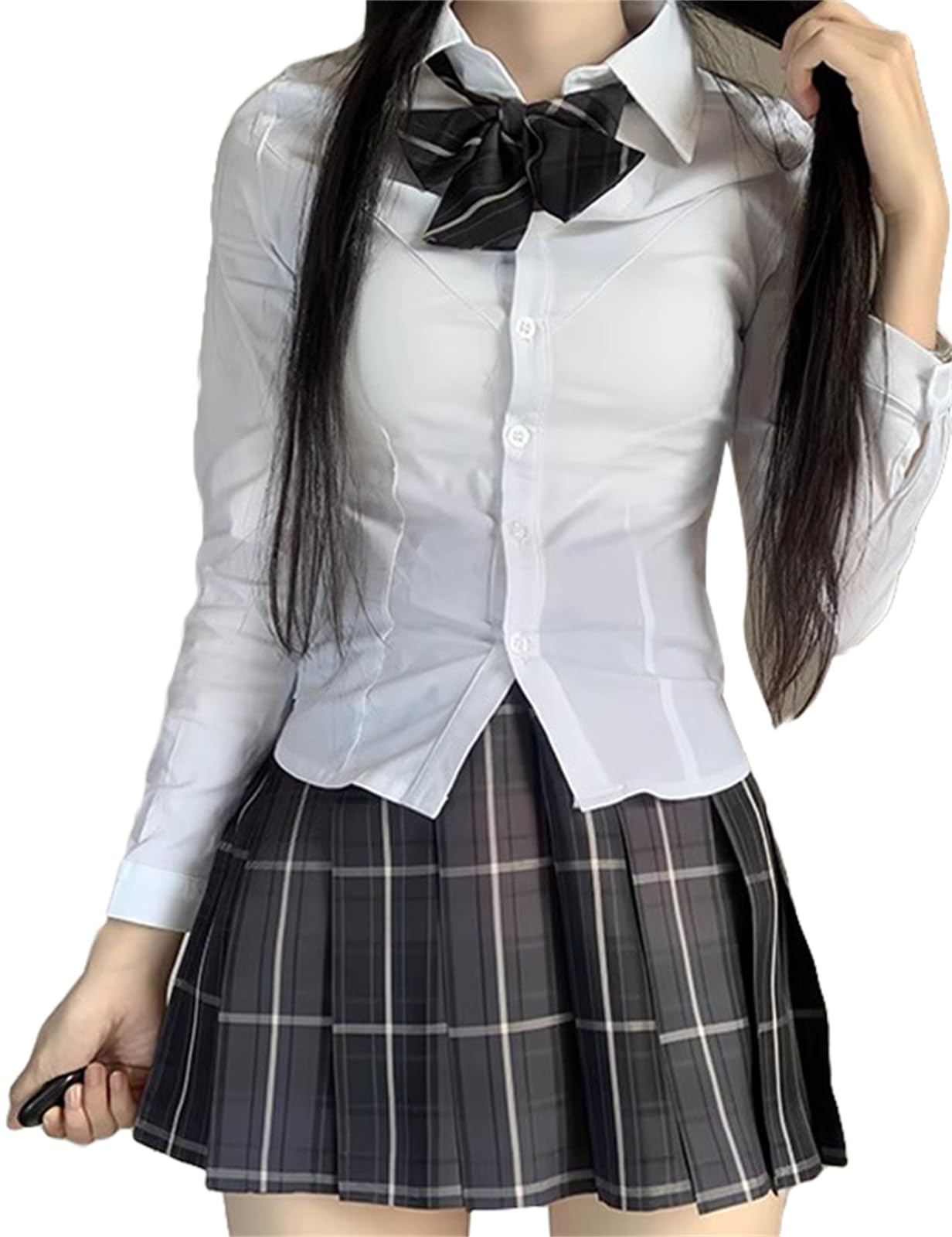 QOOLY Школьная форма Матроска Клетчатая и Идеально подходит для или Косплея Комплект из 3 предметов с длинным рукавом, Костюм, Юбка, Галстук, Выпускной, Хэллоуин, (Темно-серый - -