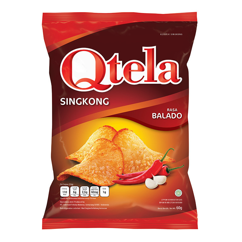 Adalah snack yang terbuat dari singkong asli. Dengan menggunakan singkong berkualitas yang diolah secara modern dan higienis, sehingga menghasilkan snack singkong bermutu tinggi. Singkong yang dipotong tipis-tipis, lalu digoreng pada suhu yang tepat, menjadikan keripik singkong memiliki tekstur yang renyah ketika digigit. Dilengkapi dengan taburan bumbu balado yang nikmat, memberikan sensasi rasa pedas manis gurih yang nikmat. Dikemas dalam kemasan modern, sehingga kualitas rasa dan bentuk keripik tetap terjaga hingga sampai di tangan konsumen. Cocok dinikmati saat bersantai atau saat berkumpul bersama teman atau keluarga. Segera miliki Qtela Keripik Singkong Balado 60gr dan rasakan nikmatnya keripik singkong dengan rasa balado pedas.