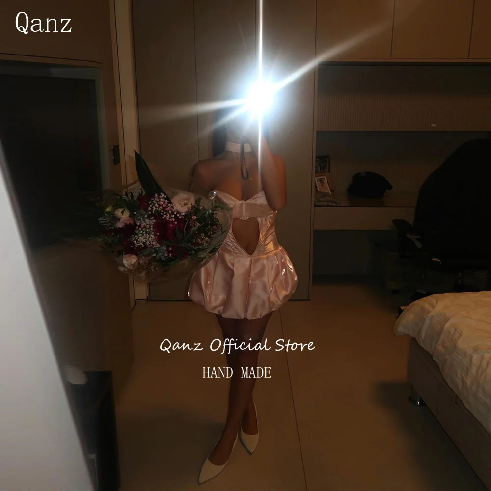 Qanz розовые блестящие атласные платья для выпускного вечера короткие трапециевидные пышные с открытой спиной сексуальные мини-женские платья без бретелек для дня рождения по индивидуальному заказу