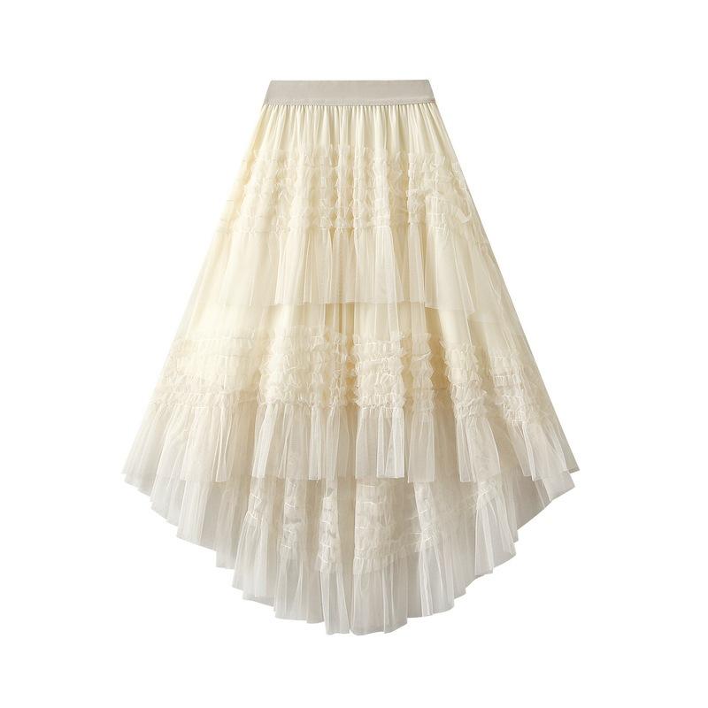 Qooth женская кружевная сетчатая юбка принцессы с оборками милое бальное платье миди для девочек тюлевая юбка на весну и лето QT2311 бежевый
