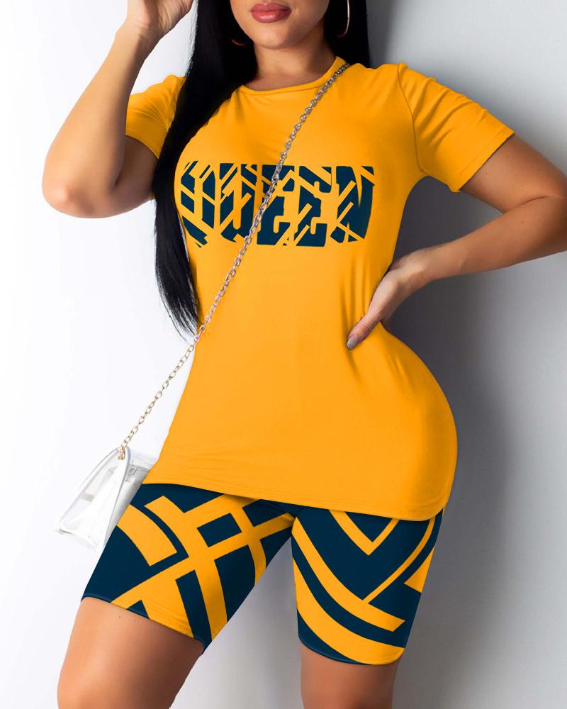 Queen Letter Geometric Print Short Sleeve Top & Shorts Set, Yellow