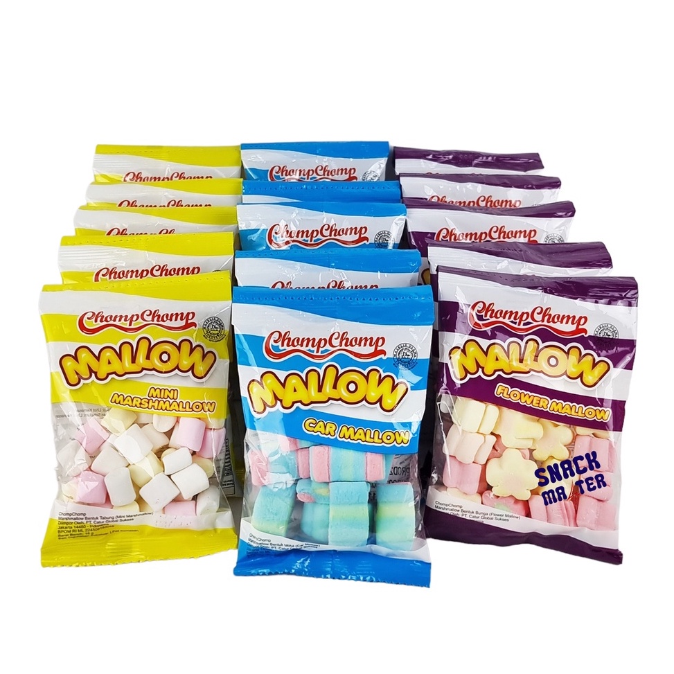 Chomp-Chomp Mallow Marshmallow adalah produk marshmallows yang dibuat dgn aneka bentuk dgn standar dengan rasa manis dari gula yang menjadi kesukaan anak-anak. Terbuat dari gula berkualitas dan bahan-bahan pilihan sehingga dapat menciptakan marshmallow yang lembut, kenyal, dan manis. Dijual per renceng isi 10 bungkus beto 16 gram.