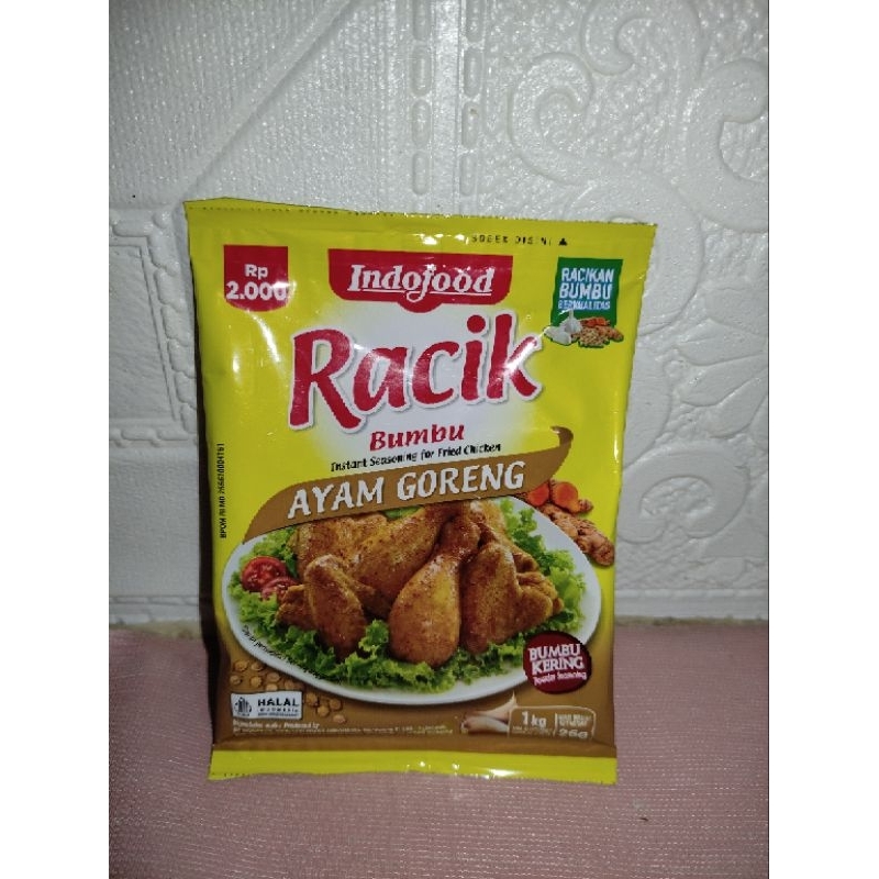 Racik ayam adalah bumbu siap pakai yang dapat digunakan untuk memarinasi ayam sebelum digoreng atau dimasak menjadi hidangan lain. Racik ayam biasanya terbuat dari rempah-rempah pilihan seperti bawang merah, bawang putih, daun serai, daun salam, gula, dan garam.