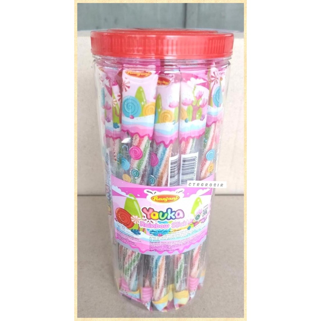 bentuk stick lima warna yang menyerupai pelangi dengan rasa aneka buah yang enak dan menyegarkan. Kemasan dalam toples dan individual wrap di setiap permennya menunjukan kehigienisan dari permen gummy ini.