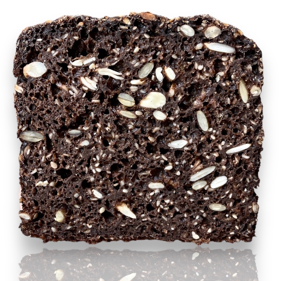 Nutrient-dense bread made of dark rye berries, black rice, varieties of ancient grains and seeds.