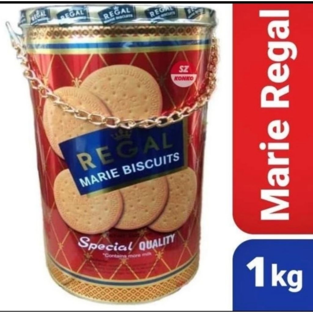 Biskuit Marie Regal 1000 gram adalah biskuit marie spesial dengan tambahan susu dan mentega, dikemas dalam kaleng yang elegan. Biskuit ini dikenal dengan kerenyahan, keharuman, dan rasa manisnya yang khas. Biskuit Marie Regal 1000 gram cocok untuk dinikmati langsung, dicelupkan ke minuman, sebagai camilan, oleh-oleh, atau suguhan dalam berbagai acara.