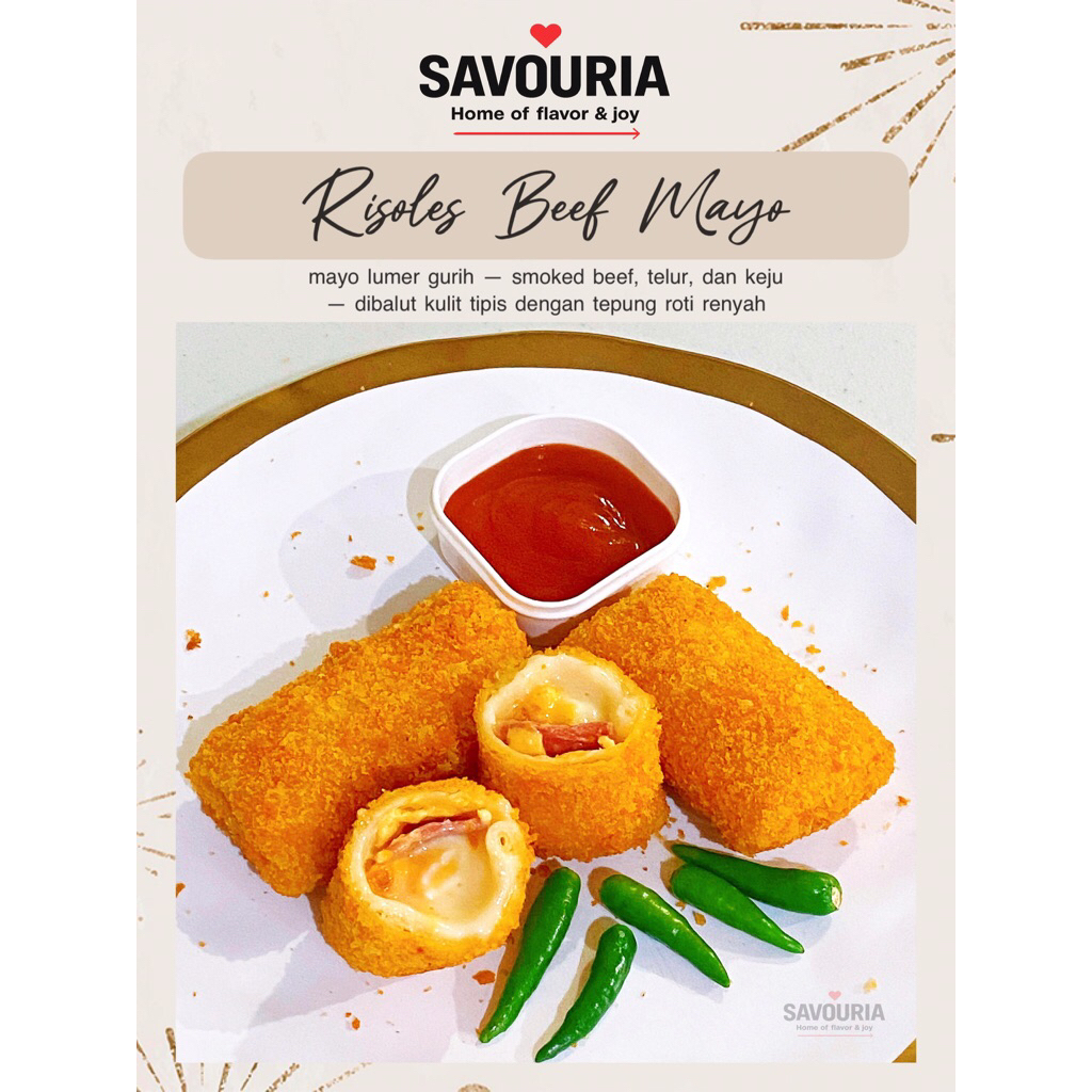 Risoles isi daging smoked beef, telur rebus, keju cheddar potong dibalur mayonaise special khas SAVOURIA dengan tingkat rasa manis, gurih segar yg pas, digulung kulit risol tipis lalu dilapisi tepung roti renyah.