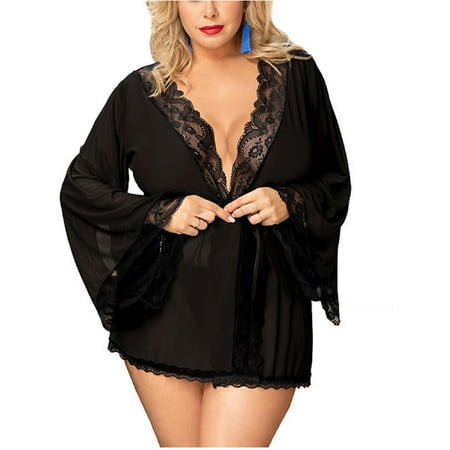 SUANMAY Women S Plus Size Erotic Lingerie Sexy Bandage Long-Sleeved Nightgown Lace Stitching Nightdress Black XL