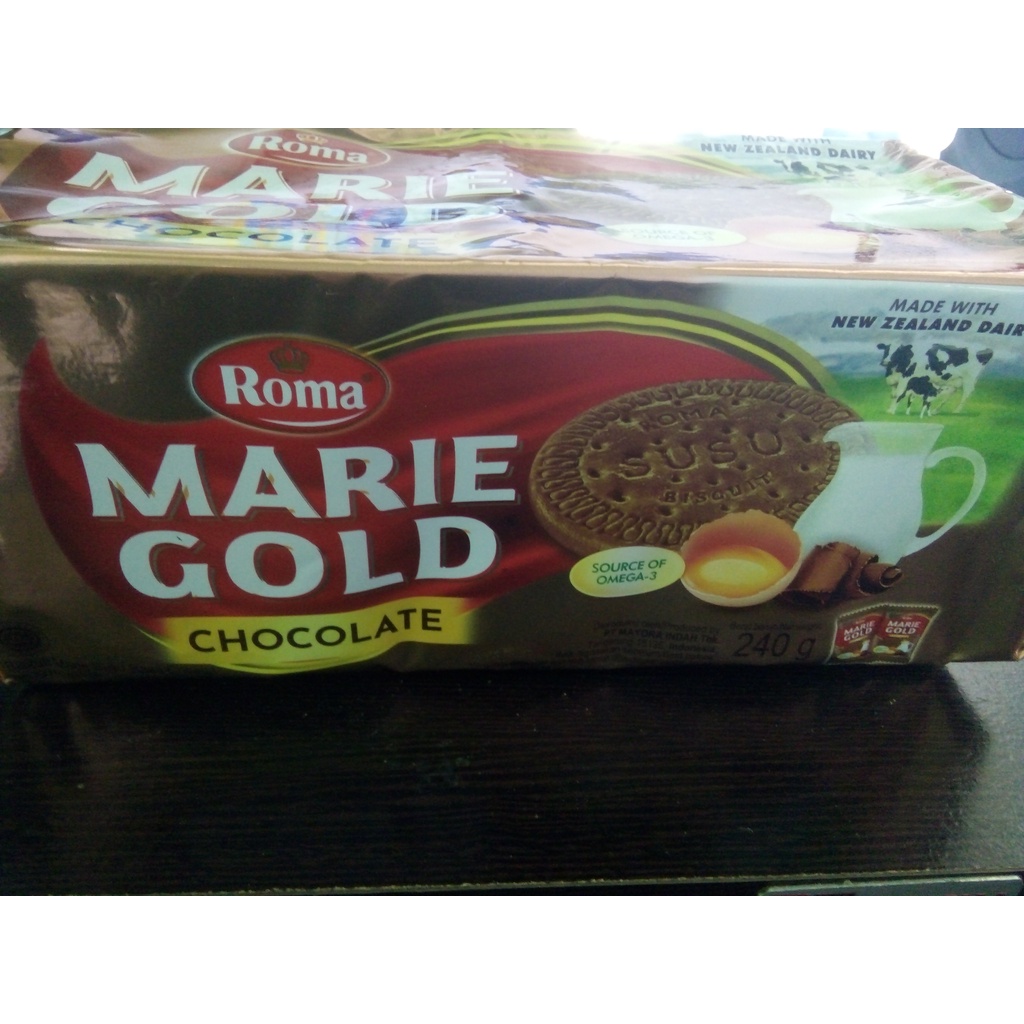 ROMA MarieGold chocolate adalah biskuit Marie pertama dengan olesan telur diatasnya. ROMA MarieGold memiliki warna keemasan karena kaya akan Omega-3Kebaikan Susu New Zealand dan rasa chocolate yang nikmat.