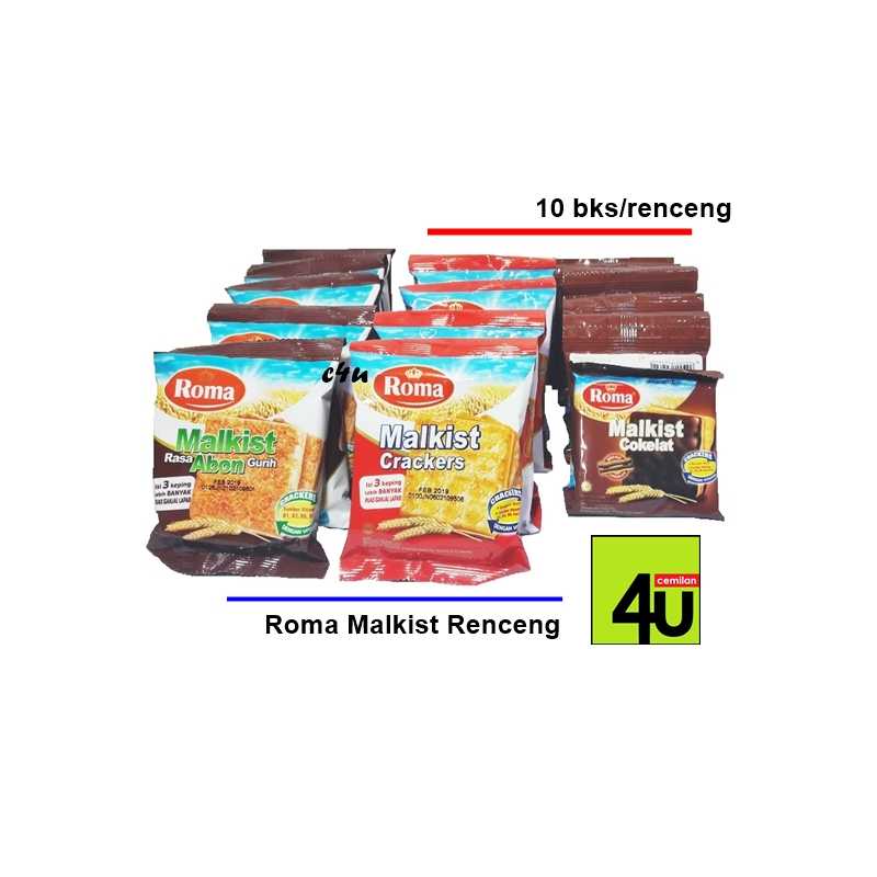 ROMA merupakan varian biskuit crackers produk utama dari PT. Mayora Indah Tbk - Tangerang. Brand biskuit ini begitu melegenda di Indonesia dgn umur lebih dari 4 dasawarsa. Salah satu varian dari ROMA adalah Malkist Crackers. Biskuit malkis, adalah biskuit ringan terbuat dari gandum, susu, dan bahan2 lainnya. Walau makanan ringan, biskuit ini mengandung segudang kebaikan gandum dan susu, serta berbagai vitamin yg menyertainya dan tentu saja enak dan renyah. Sehingga biskuit ini begitu populer dimasyarakat utk semua usia. Roma Malkist, berkembang seiring perkembangan teknologi dan jaman. Bukan sebagai cemilan jadul lagi, saat ini Roma Malkist tersedia dalam beberapa varian yg begitu trendy namun tidak mengurangi kelezatannya. Berikut varian yg tersedia: 1. Malkist Original: biskuit malkis original yg renyah dan manis dgn taburan gula diatasnya. Dijual dgn kemasan renceng berisi 10 bks kemasan individu, mengandung 3 pcs malkis dalam setiap bksnya. Netto: 27gr. 2. Malkist Abon: biskuit malkis renyah dgn taburan gula dan bubuk abon diatasnya. Menciptakan rasa yg unik, gurih, manis, asin, yg sangat memanjakan lidah. Dijual dgn kemasan renceng berisi 10 bks kemasan individu, mengandung 3 pcs malkis dalam setiap bksnya. Netto: 27gr. 3. Malkist Coklat: biskuit malkis renyah dgn taburan gula dan lapisan coklat penuh disisi lainnya. Kombinasi malkis renyah gurih dgn kelezatan coklat yg seimbang. Dijual dgn kemasan renceng berisi 10 bks kemasan individu, mengandung 2 pcs malkis dalam setiap bksnya. Netto: 21gr. Beratribut BPOM RI dan Halal MUI, silahkan diorder buat bekal yg praktis kemanapun anda suka..