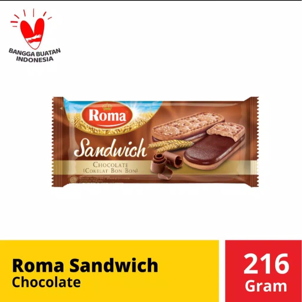Biskuit dengan kebaikan cokelat yang meleleh di mulut, santai dan rileks bersama biskuit Roma Sandwich Chocolate. Gigiti dan rasakan biskuit dengan krim cokelat di tengah yang meleleh dimulut, Biskuit ini dicintai oleh semua, baik yang tua maupun yang muda.