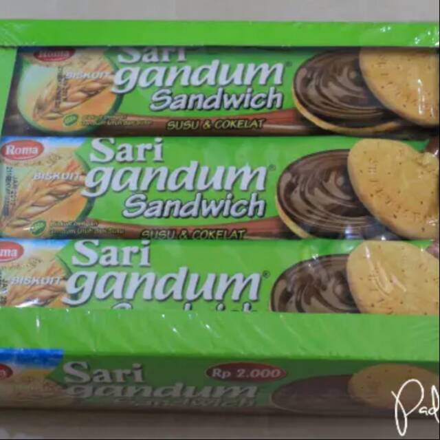 Biskuit Gandum Sandwich dengan susu dan krim Roma Sari Gandum Sandwich terbuat dari gandum pilihan, dengan susu di biskuitnya, dan vitamin serta krim susu cokelat. Baik untuk dinikmati oleh seluruh keluarga.