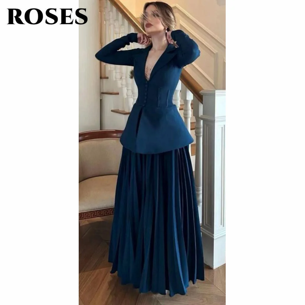 ROSES Пятно-синее вечернее платье с v-образным вырезом Элегантное ночное платье Плиссированное платье знаменитости с пуговицами Вечерние платья для женщин по индивидуальному заказу