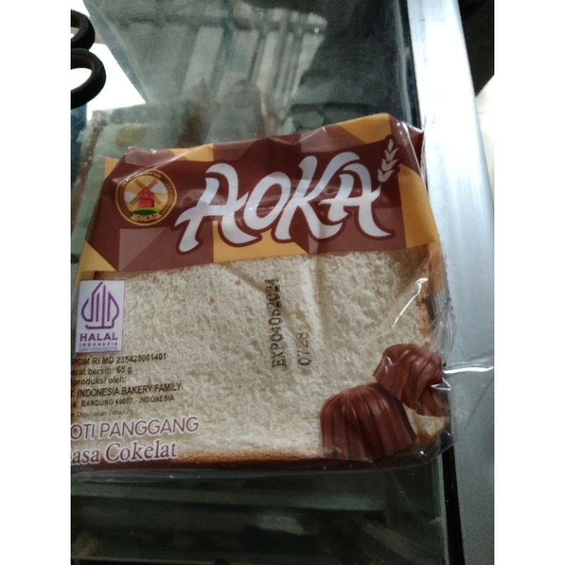 AOKA Roti Panggang dengan bentuk sandwich roti tawar, berisi krim dan selai sebagai varian rasanya. Dikemas dalam plastic pack singles yang higienis. Sudah mendapat PIRT dan Halal MUI. Masa kadaluarsa 1-3 bulan sejak tanggal produksi.