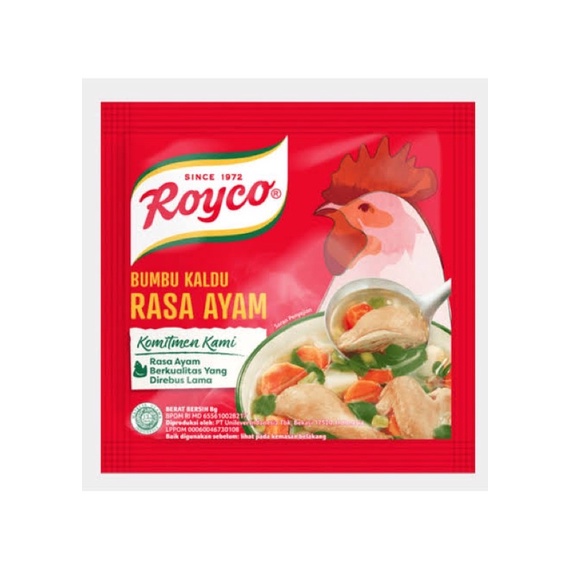 Royco bumbu penyedap rasa Kaldu Ayam yang dibuat dengan daging ayam asli dan rempah-rempah alami khas Indonesia yang direbus lama dan diproduksi secara higenis sehingga memberikan kaldu gurih dan rasa ayam lezat untuk semua jenis masakan Indonesia.