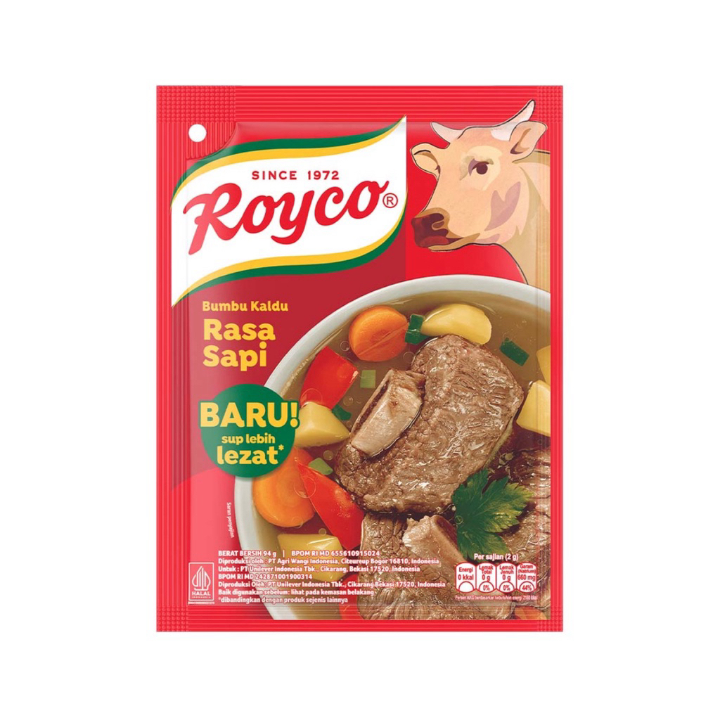 Royco Bumbu Kaldu Penyedap Rasa Sapi 94 g adalah salah satu inovasi bumbu masakan Indonesia berbekal pengalaman panjang selama 30 tahun yang diracik dari bahan-bahan dan rempah pilihan, seperti daging sapi pilihan yang direbus secara baik. Mudah larut dan meresap sehingga membantu memberi rasa kaldu yang mantap pada masakan Anda serta membantu memasak dengan mudah dan menyenangkan.