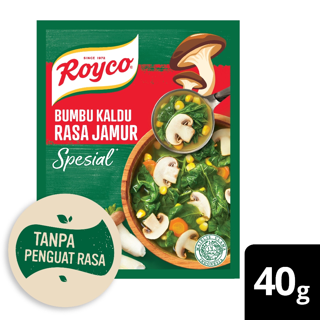 Royco Kaldu Spesial Jamur dierbuat dari bahan jamur berkualitas, tanpa penguat rasa sehingga cocok untuk berbagai jenis masakan, seperti MPASI dan hidangan keluarga lainnya.