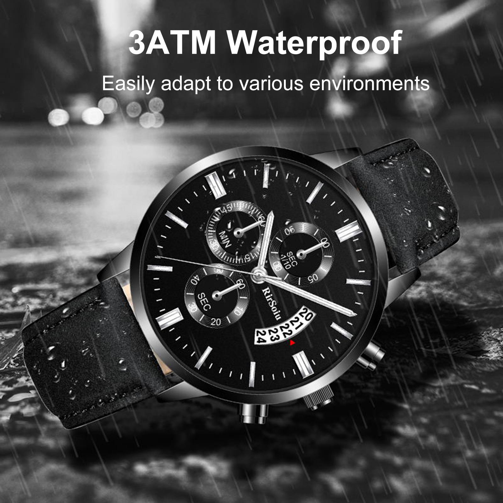 RS0053 Модные роскошные мужские деловые часы Элегантные кварцевые наручные часы с кожаным ремешком 30 м Водонепроницаемые/светящиеся/календарные аналоговые часы для мужчин