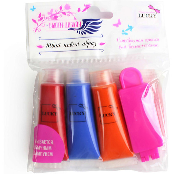 Характеристики товара: • тип: декоративная косметика • комплектация: краска для волос (3 цвета красный, синий, оранжевый), спонж • материал: косметические средства, пластик • размер упаковки: 13x1,5x10 см • вес: 60 г • упаковка: блистер на картоне • стильный дизайн • соответствие стандартам качества Набор красок для волос поможет создать неповторимый и яркий образ. Декоративная косметика Lucky является гипоаллергенной и изготовлена из натуральных компонентов. Краску легко смыть обычным шампунем.