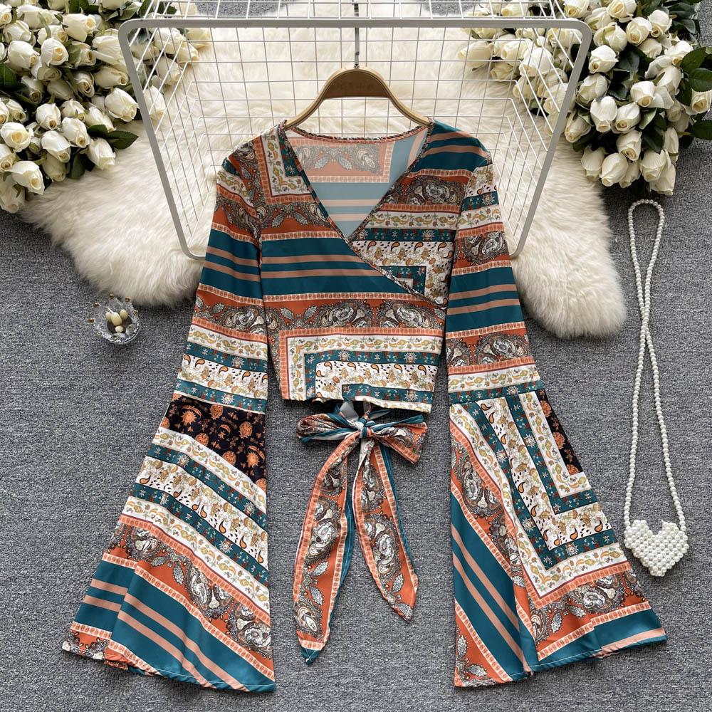 RUGOD Винтажный принт Зашнурованный с длинными рукавами Рубашка Осень Женская V-образный вырез Рубашка Красивая Маленькая Рубашка