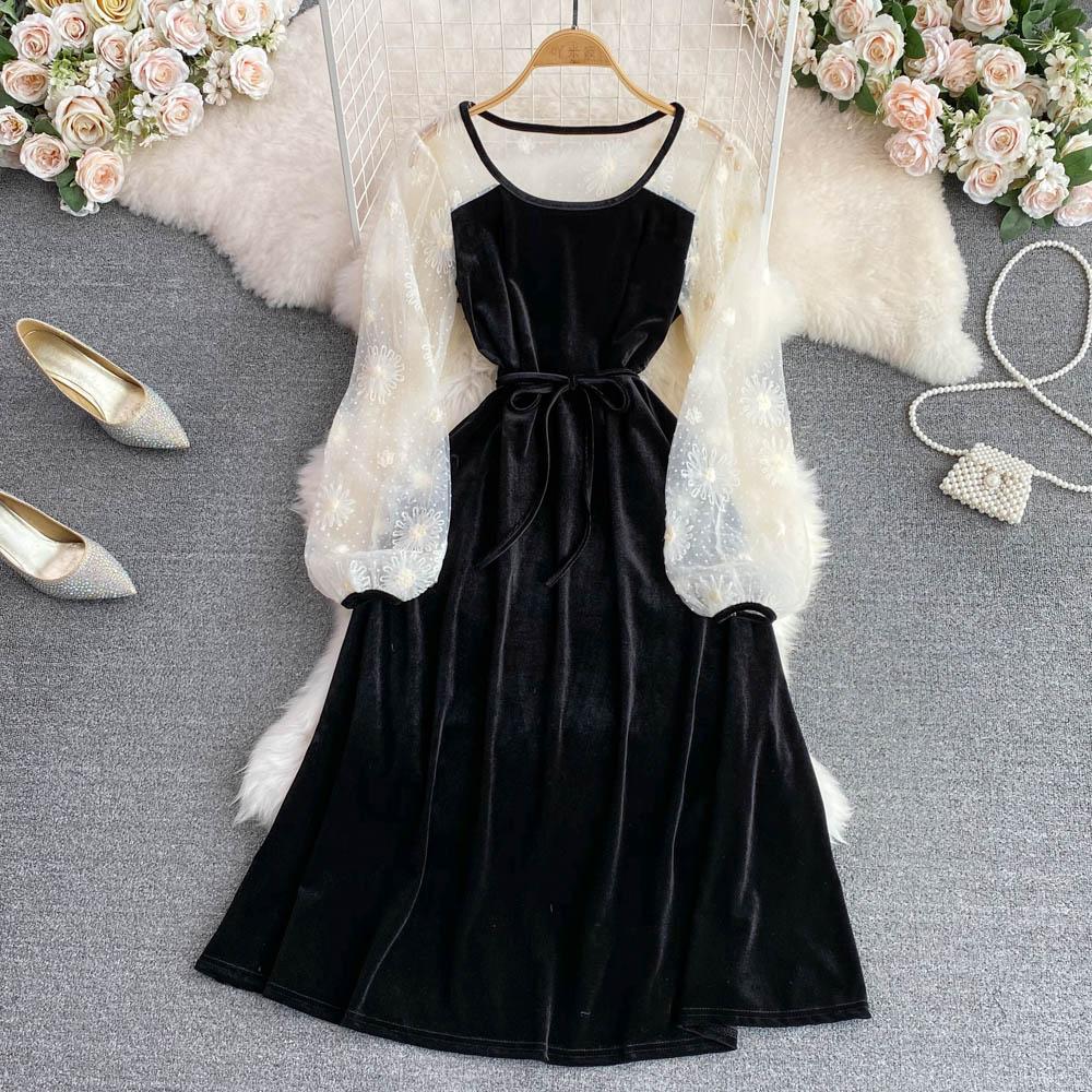 RUGOD винтажное сетчатое платье с круглым вырезом, женское бархатное платье трапециевидной формы с тонкой талией, длинное платье