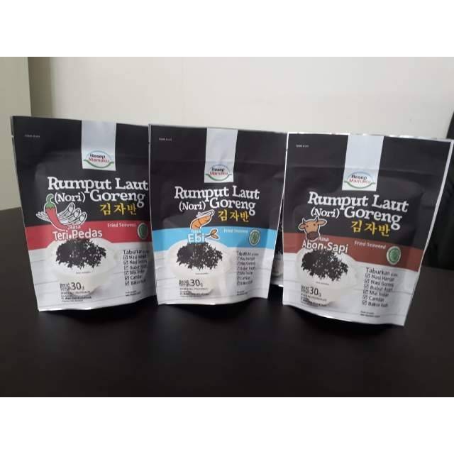 Rumput Laut (Nori) goreng Resep Mamaku adalah rumput laut yang digoreng (bukan dipanggang), dengan citarasa uang khas & unik. Bahan baku Rumput Laut asli dari Korea