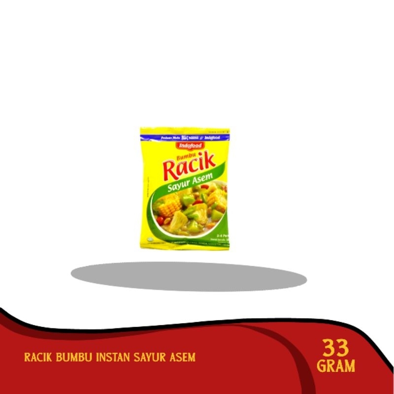Racik Bumbu Instan Sayur Asem 33 g adalah bumbu siap pakai untuk sayur asem favorit keluarga, jadi masak anti ribet, auto bisa! Diracik dari rempah alami berkualitas, tanpa bahan pengawet dan pewarna buatan, dan rasanya seenak racikan sendiri. 1 bungkus Bumbu RACIK Sayur Asem cukup untuk 1x masak untuk 3-4 porsi.