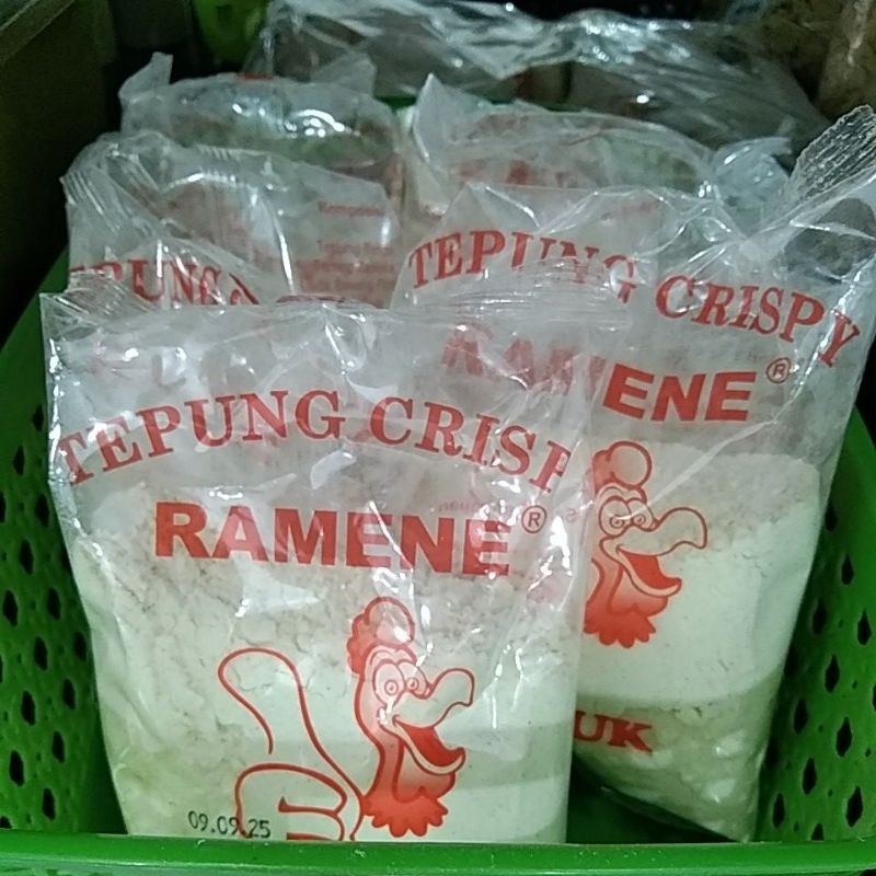 Tepung krispi Ramene. tepung bumbu serbaguna yg praktis tidak perlu menambah bumbu lain lagi. Tepung ini menghasilkan lapisan luar renyah dan garing pada makanan yang digoreng, seperti ayam, tempe, tahu, atau jamur. Berat 140gram.