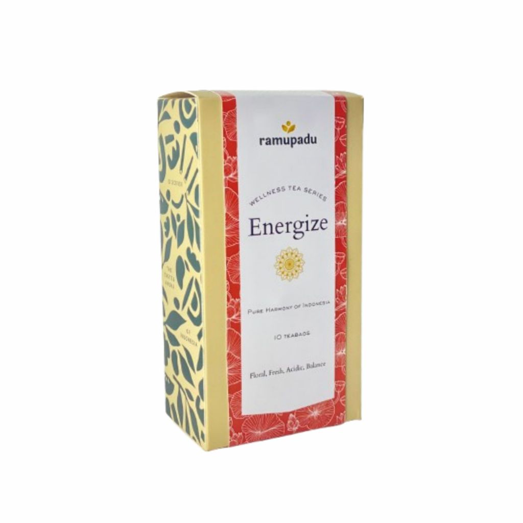 Mulai hari dengan secangkir seduhan Energize. Racikan dari teh hijau, bunga hibiscus, daun peppermint, daun pandan, bunga kenop, bunga mawar, dan jahe. Energize mengandung antioksidan, prebiotik dan memiliki kandungan kafein yang membantu tubuh lebih berenergi. Teh yang memiliki wewangian floral dan 'sweet note' ini cocok untuk diminum kapanpun apalagi di pagi hari.