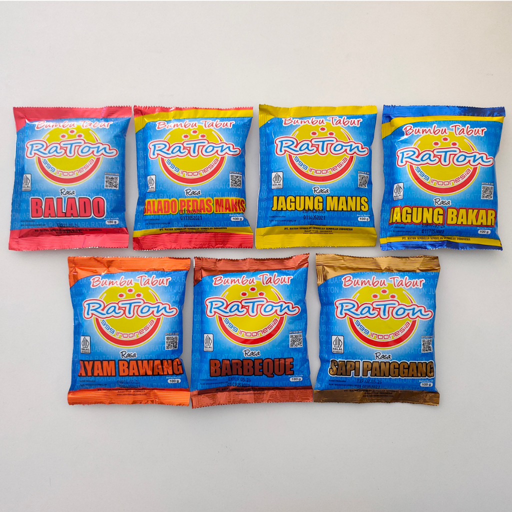 Raton Bumbu Tabur tersedia dalam berbagai pilihan rasa yang cocok untuk berbagai camilan favorit kita, seperti: Kentang goreng, Potato Chips, Makaroni, Pop Corn, Cimol, Cimol, Tahu Bulat, Basreng, Kerupuk, dan berbagai macam keripik, dll.