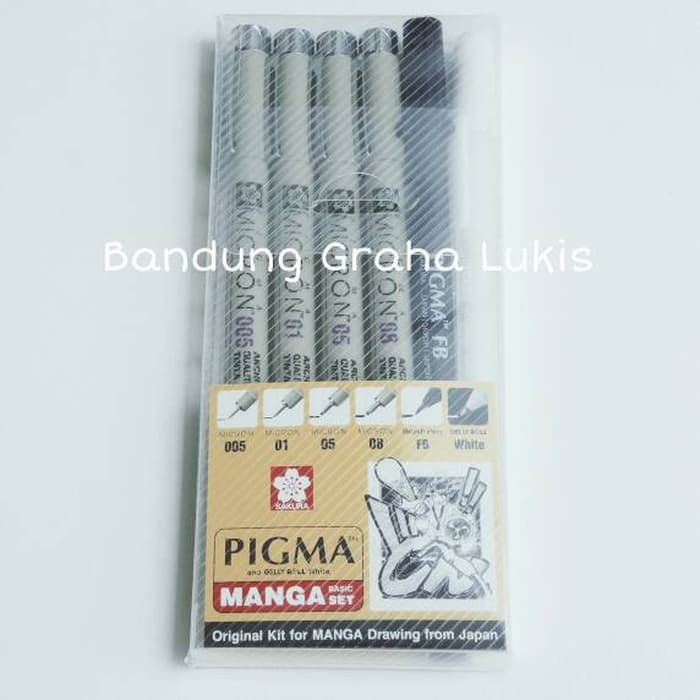 Pigma Basic 1 set terdiri dari Pigma Micron 005, 01, 05, 08, Pigma Fine Brush dan Sakura Gelly Roll White.