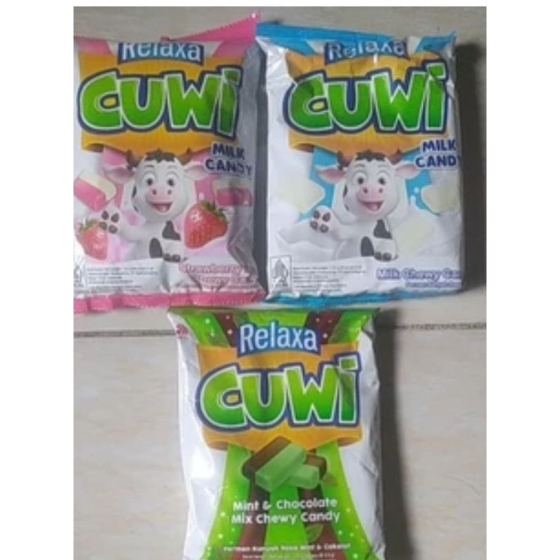Relaxa Cuwi adalah permen kunyah dengan rasa mint, stroberi dan susu dingin dan cokelat lezat. Permen ini memiliki tekstur kenyal dan bisa membuat Anda segar dan pede saat bergaul.