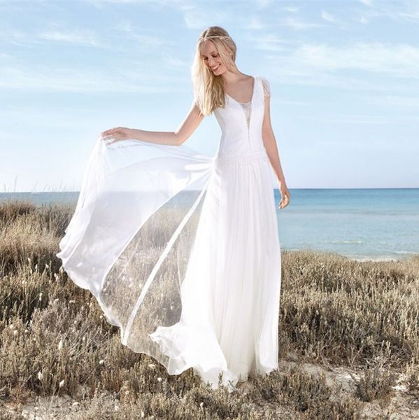 Rembo Стайлинг Пляж Свадебные Платья С Кружевной Крышкой Рукава Погружаясь Шеи Дешевые Свадебные Платья A-Line Длина Пола Шифон Свадебное Платье