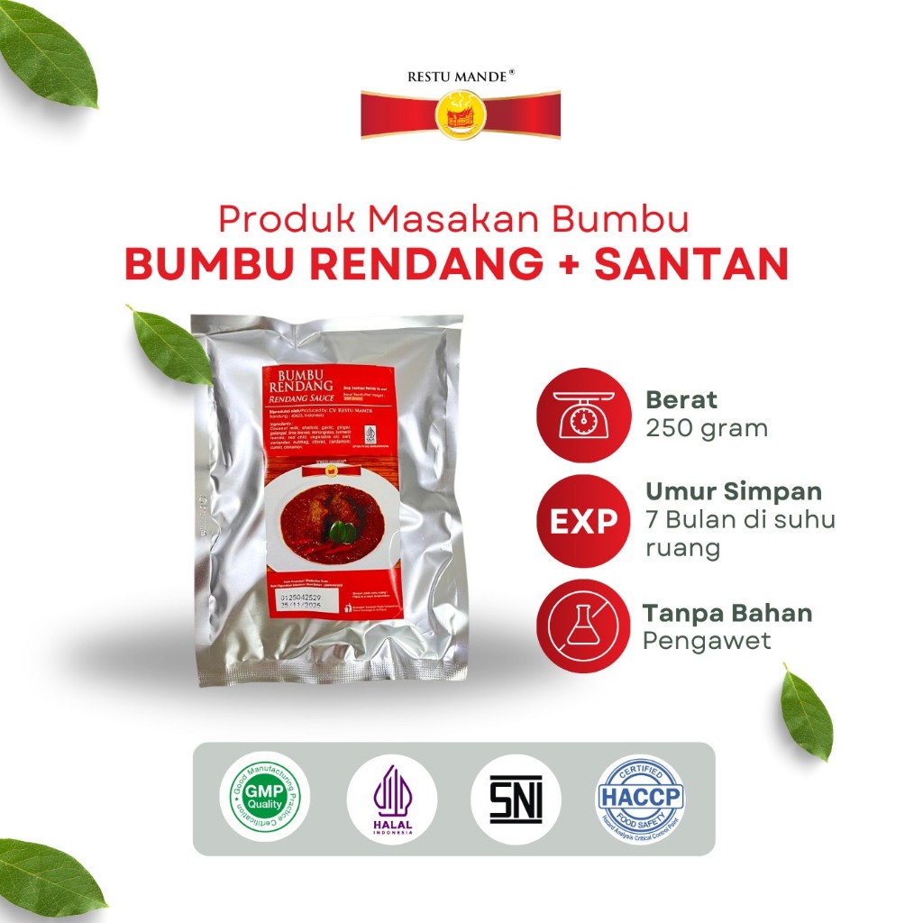 Bumbu Rendang Restu Mande merupakan Bumbu Otentik Khas Rumah Makan Padang Restu Mande yang berlokasi di Jalan Brigjen Katamso no 64, Bandung. dikemas menggunakan plastik vacuum tahan panas, melalui proses packing modern dengan sterilisasi. Bumbu Rendang Restu Mande dibuat dari rempah-rempah pilihan terbaik, tanpa MSG, juga tanpa gula dan bahan pengawet kimia.