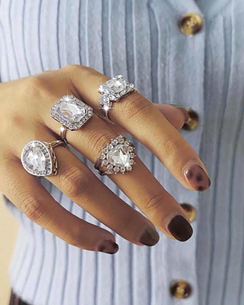 Rhinestone Heart & Waterdrop & Geo Shaped Rings Set, Style1