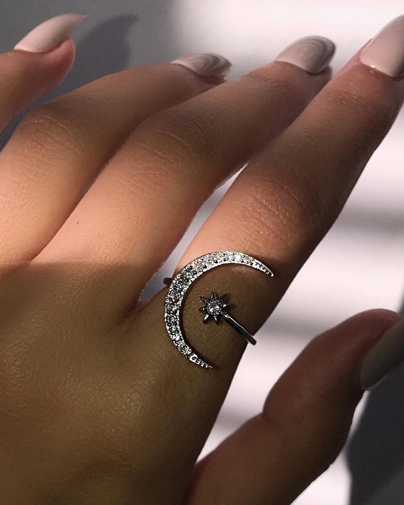 Rhinestone Moon Star Pattern Ring, Silver
