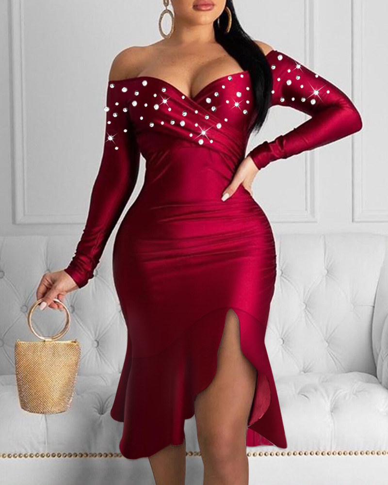 Rhinestone Off Shoulder Ruffles Slit Evening Dress, Red