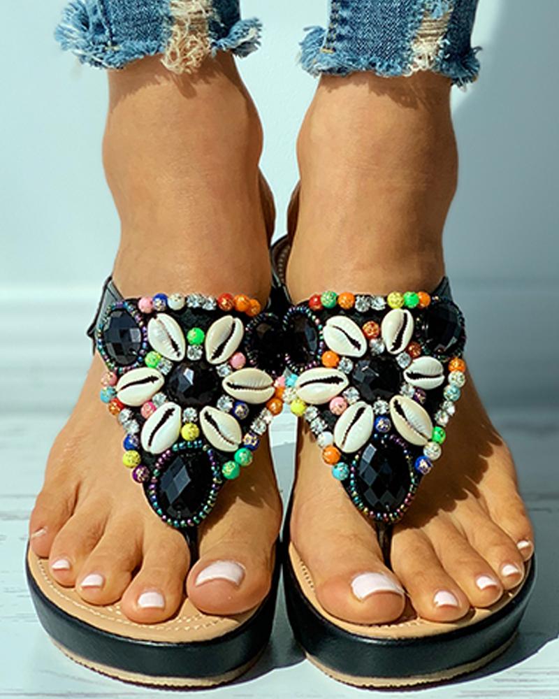 Rhinestone Shell Pattern Toe Post Wedge Sandals, Black