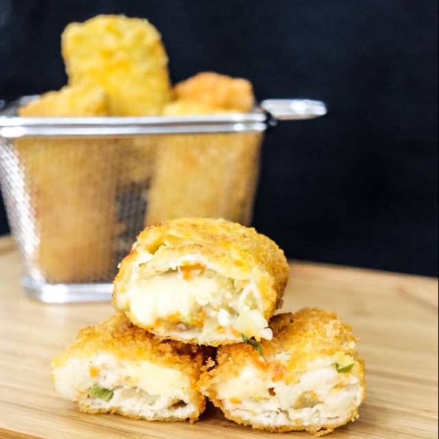 The original version of our homemade risoles, stuffed with chopped potatoes, carrots, chicken, and very generous amount of cheddar cheese