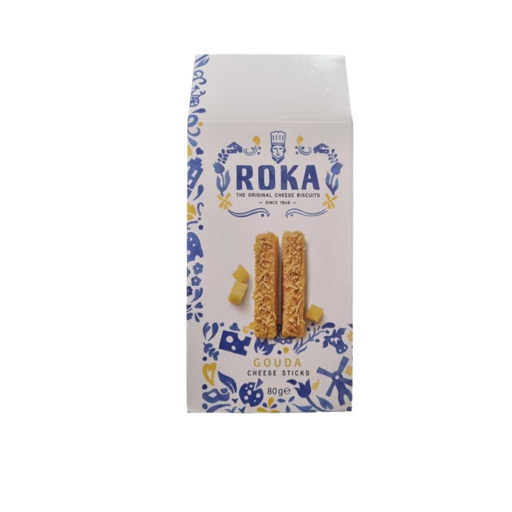 The cheese sticks are baked from the same refined puff-pastry (90 layers) and over 30% carefully matured old Gouda cheese, as the cheese crispies. However, the pastry is cut in a different way, resulting in a different shape and bite. Besides this, the ROKA cheese sticks have the same intense and delicate cheese taste that melts on the tongue.