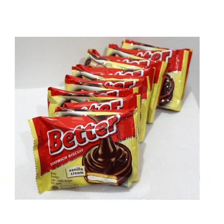 Better sndwich Biskuit Vanila Cream adalah biscuit Sandwich renyah dengan balutan coklat yang tebal serta sensasi cream vanila yang lembut. Dengan menggunakan bahan-bahan yang berkualitas yang menjadikan kombinasi yang pas dilidah, serta memberikan rasa yang sempurna untuk setiap saat dan cocok untuk dijadikan cemilan saat santai.