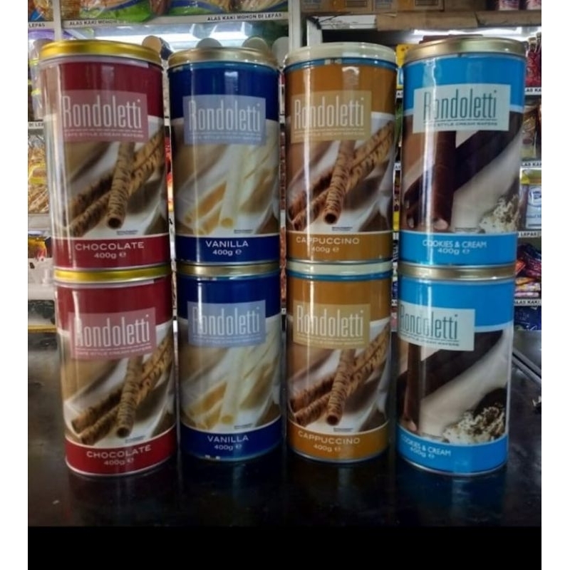 • Rondoletti Wafer Roll Premium Kualitas Expor 400 gr memiliki kemasan Label di Sticker pada Kaleng, dan Tutup Kaleng juga sedikit berbeda dengan tutup warna Gold