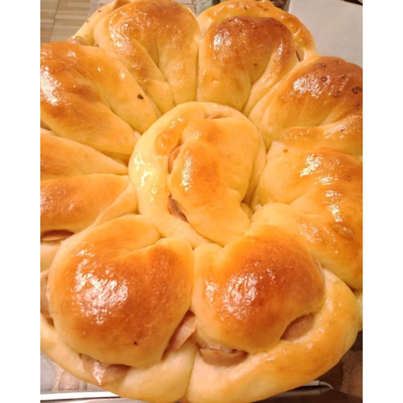 Roti dengan bentuk bunga mawar isinya sosis dan mayonnaise ditambah saos sambel