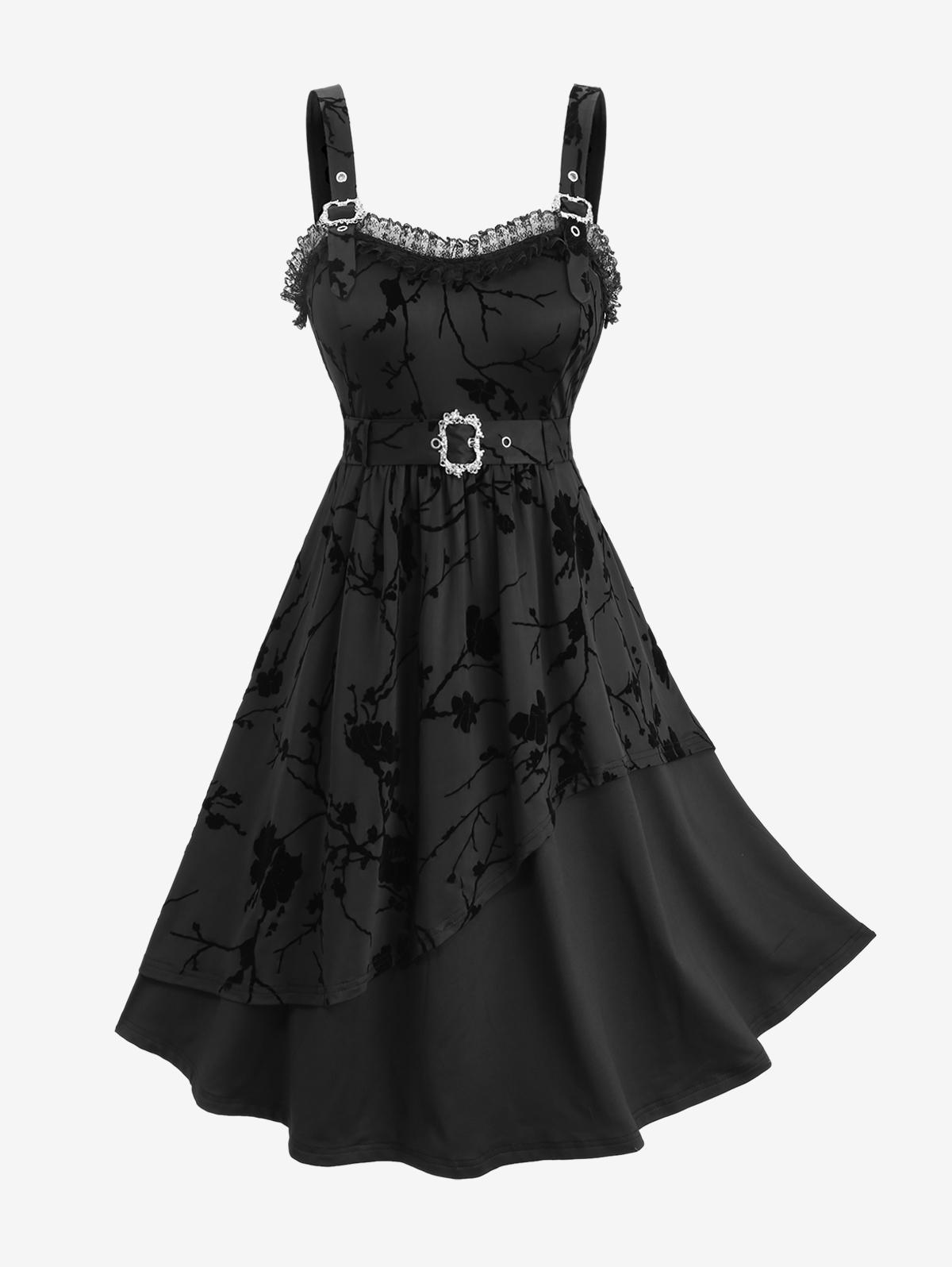 Rosegal Плюс Размер Цветочный Флокированный Многослойный Оборки Кружевная Отделка Пряжка Пояс Винтажный A-образный Майка Платье 4XL чёрный