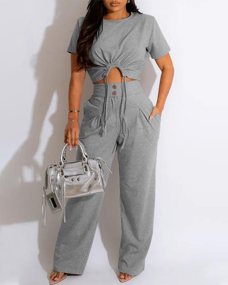 Round Neck Drawstring Crop Top & Buttoned Pants Set, Gray