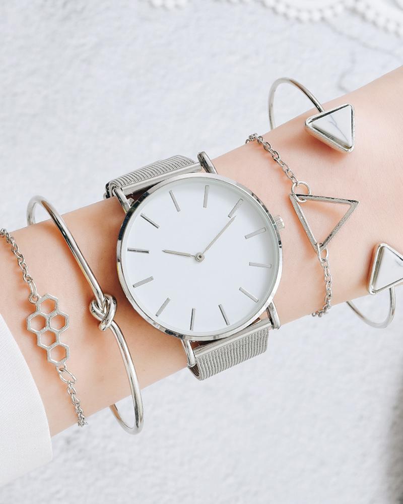 Round Quartz Watch & Geometric Chain Bracelet Set, Silver