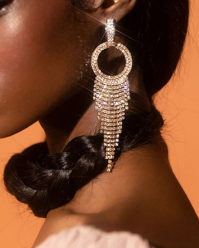 Round Shaped Tassel Design Rhinestone Drop Earrings, Gold